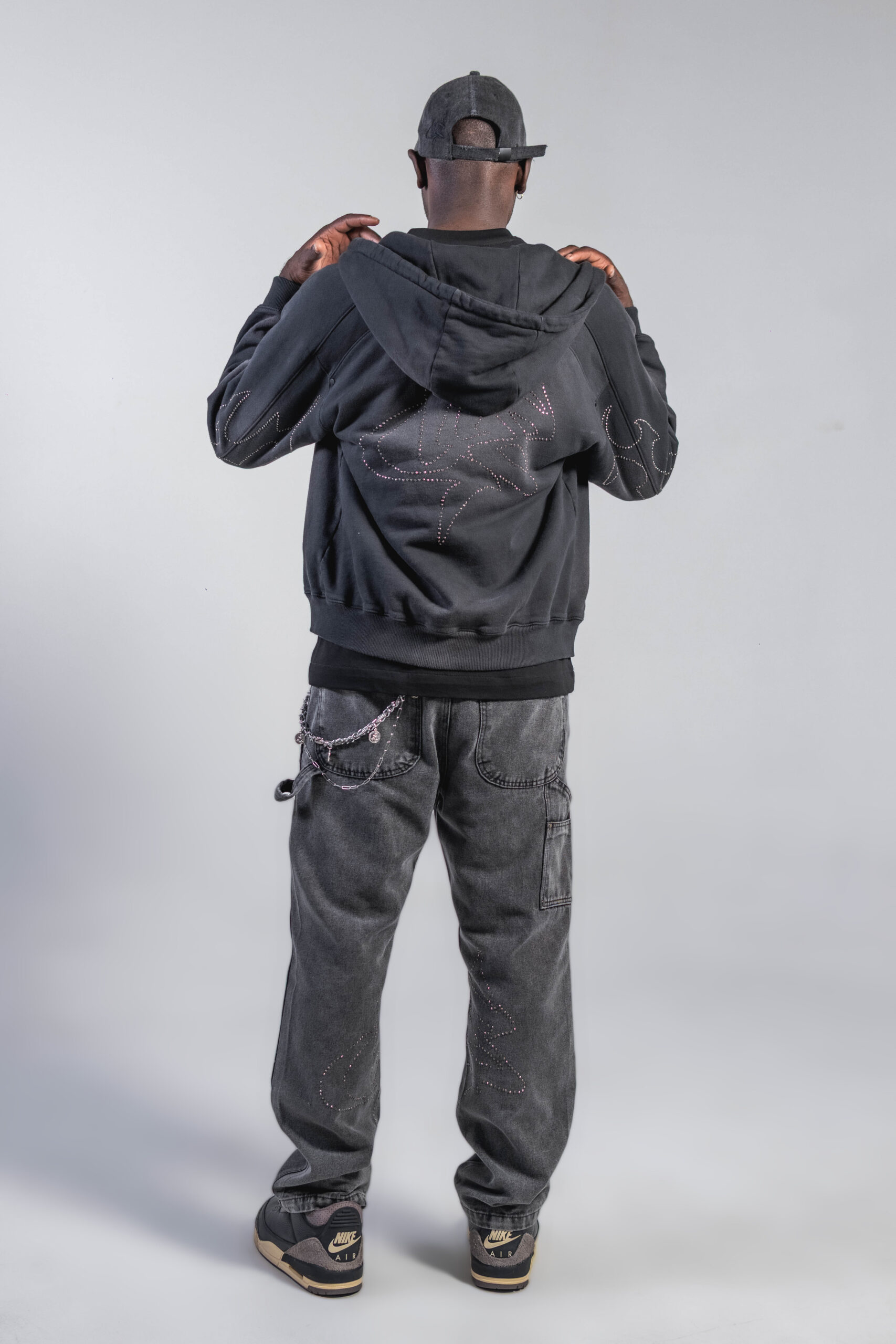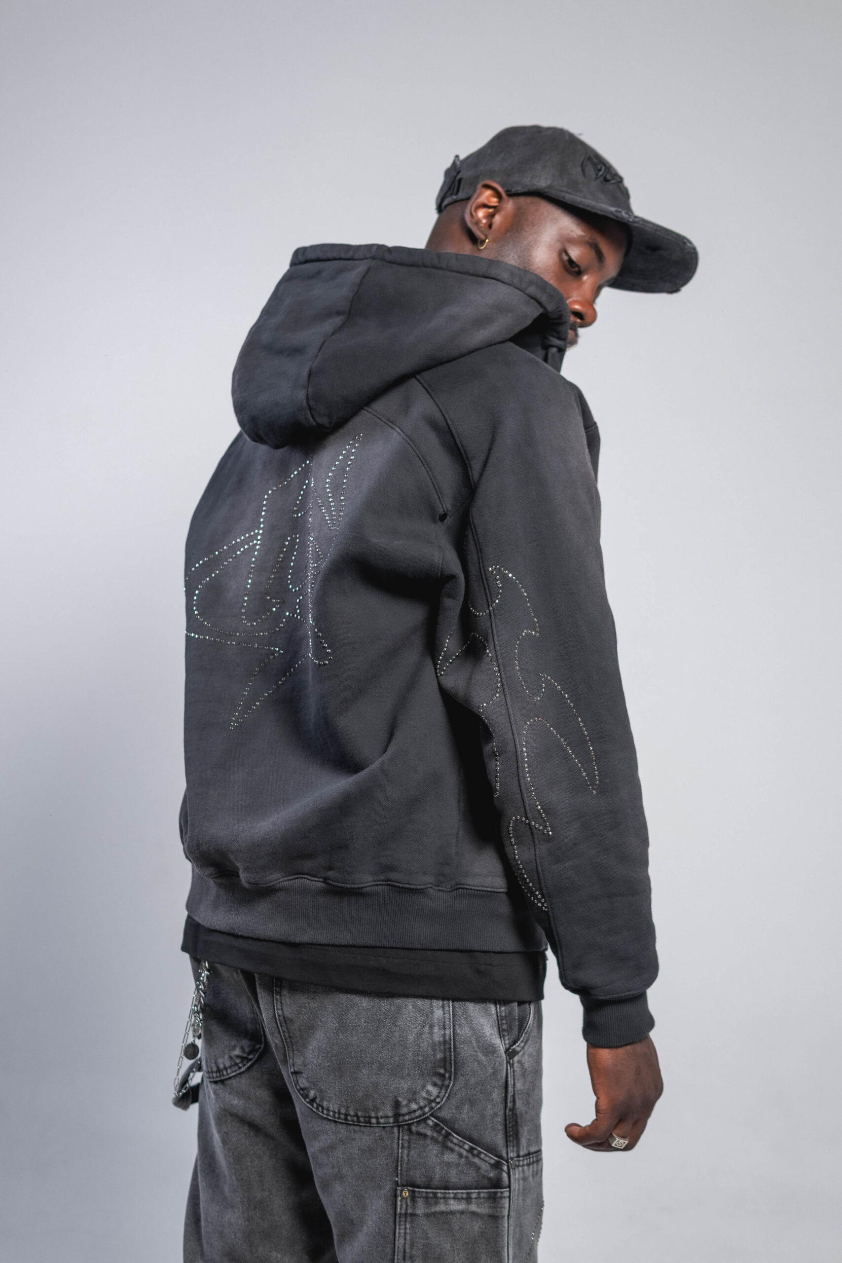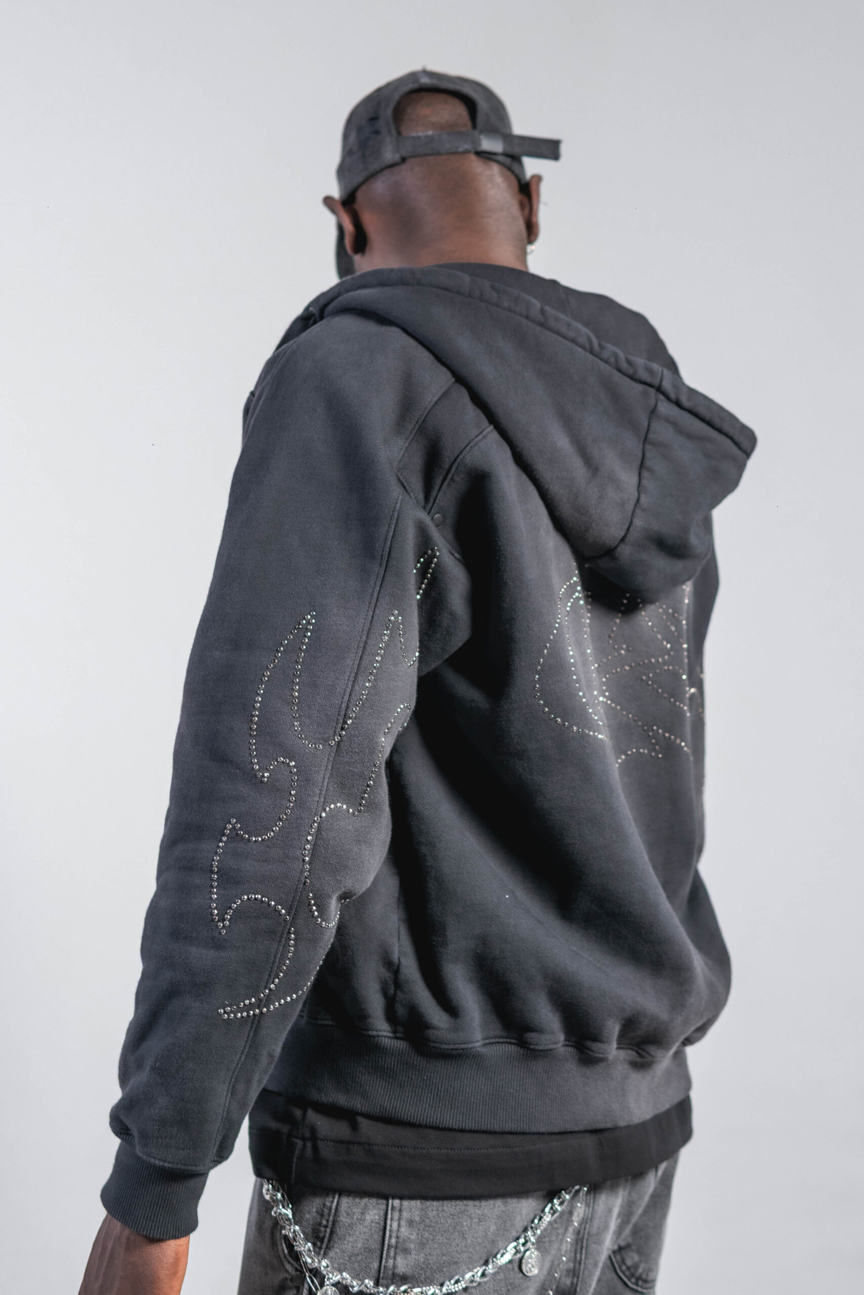 Buzo con cremallera en tono gris oscuro/negro con lavado enzimático, confeccionado en 100% algodón de 430 g, con bordado, detalles tribales en piedras y logo CHS en piedras, ofreciendo estructura, textura y un acabado distintivo.