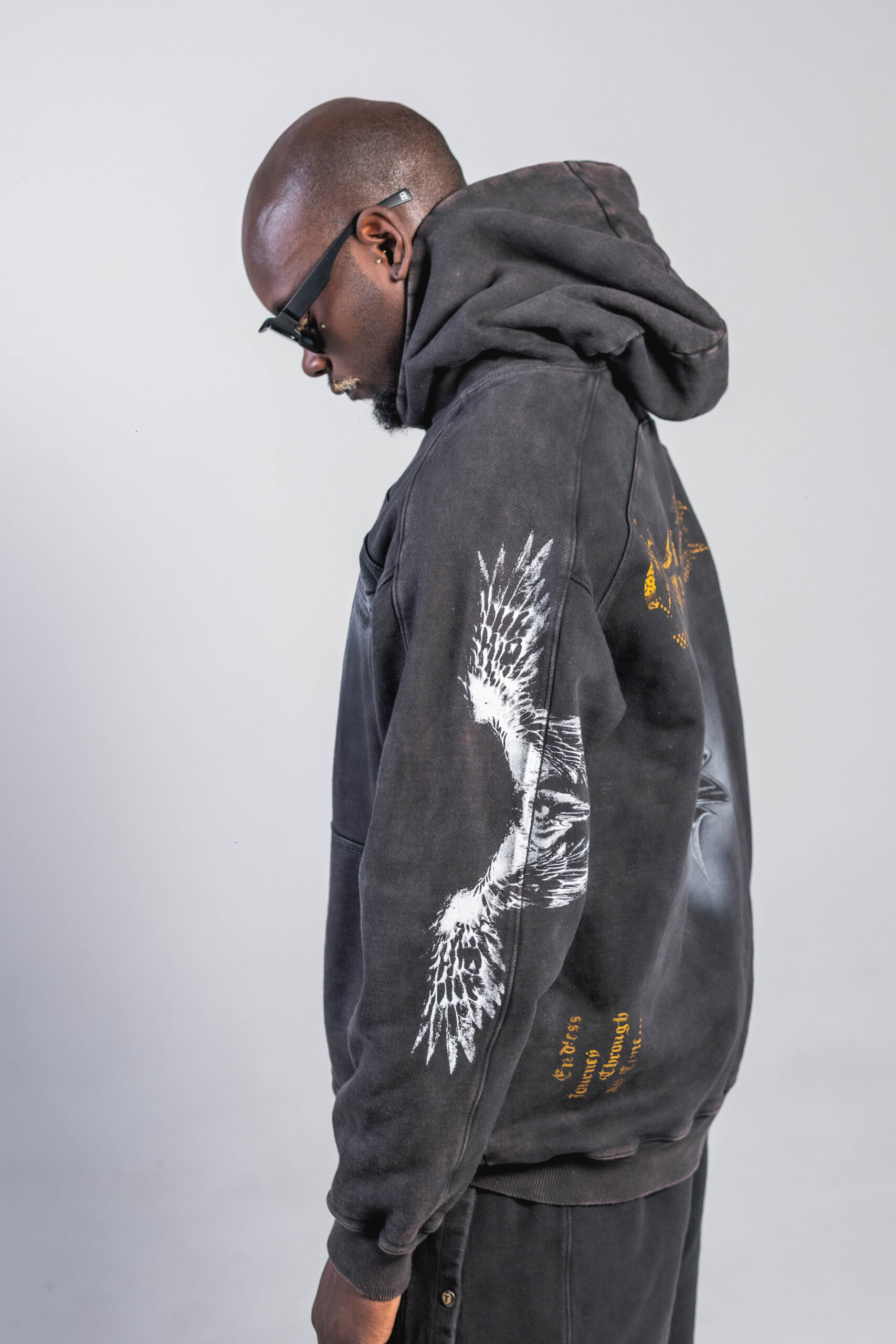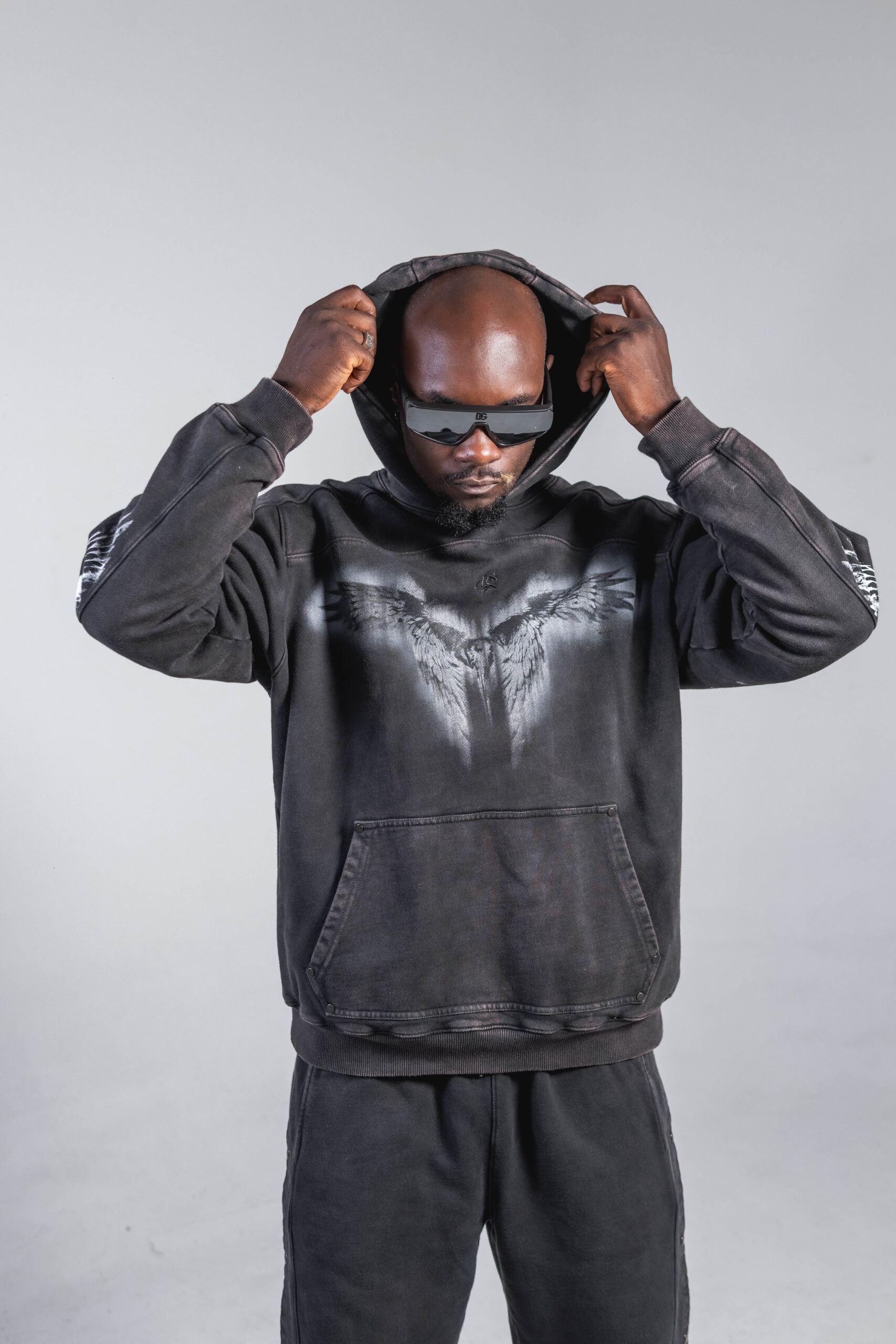 Buzo en tono gris oscuro/negro, confeccionado en algodón 100% de 430 g, con lavado enzimático que genera un acabado vintage uniforme. Incluye estampación en serigrafía de alta definición en pecho, mangas y espalda, además de detalles en taches metálicos. Capucha amplia, puños y ruedo en rib, bolsillo tipo canguro y corte relajado, estructura y tacto suave.