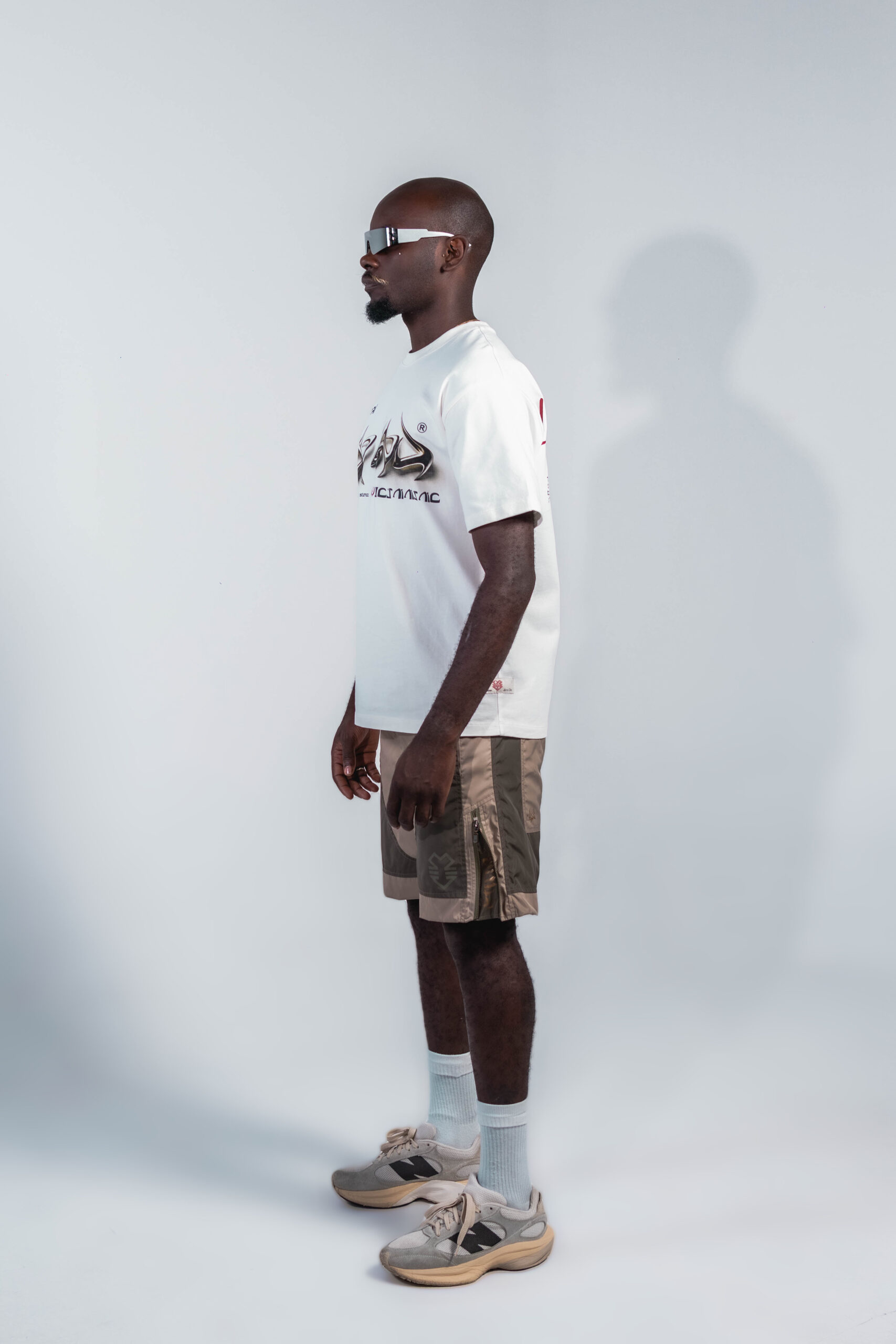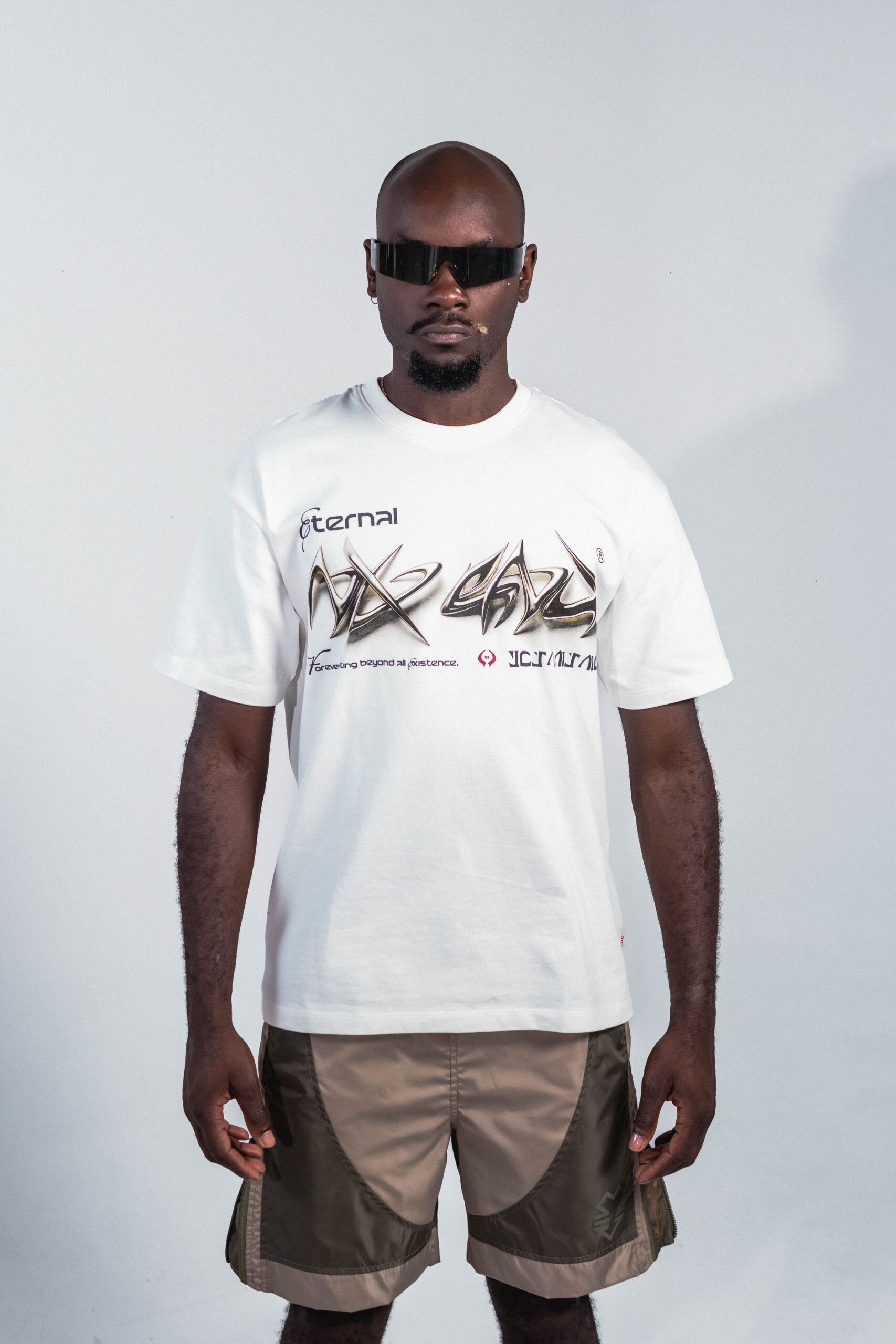 camiseta ivory de corte relajado con gráfico metálico futurista al frente, confeccionada en 100% algodón peruano de 260 g y cuello en rib, ofreciendo una suavidad superior y caída impecable.