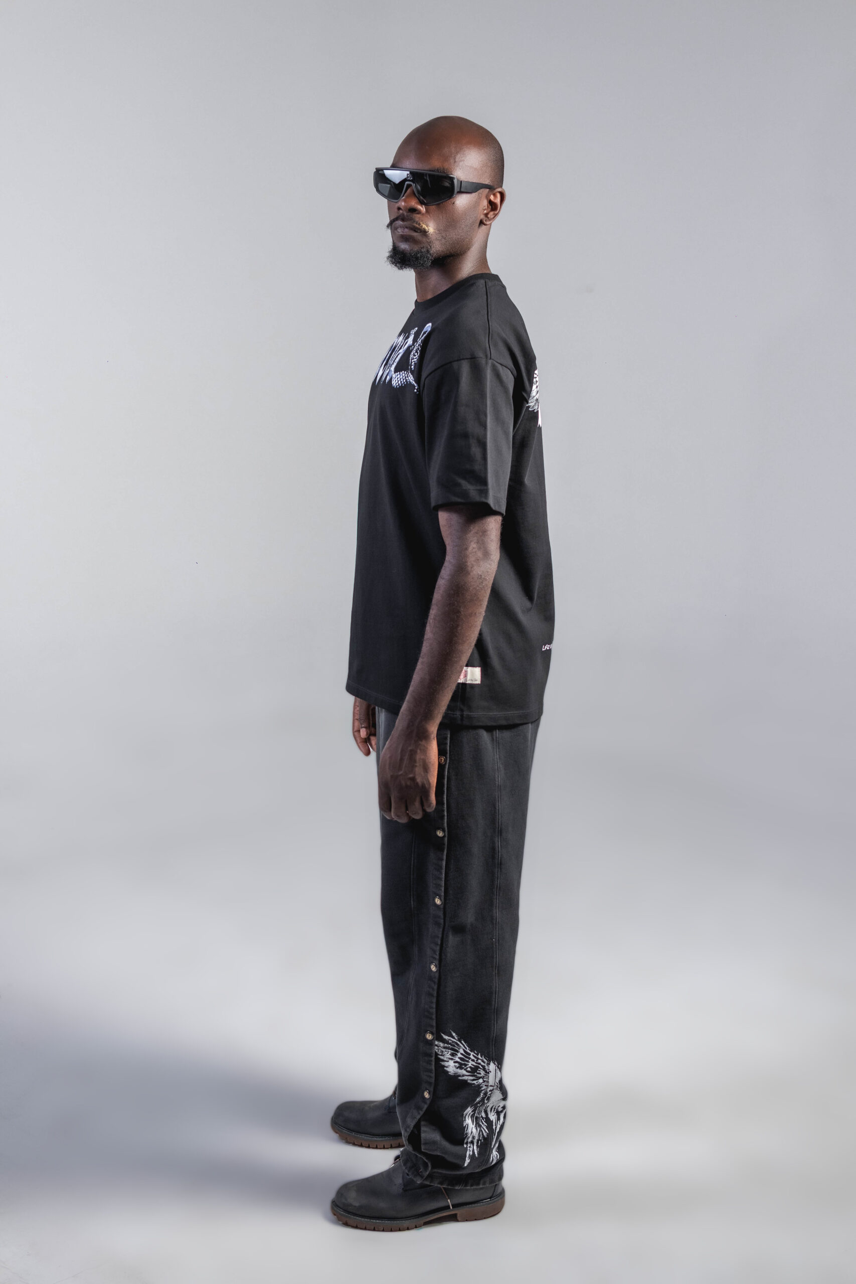 Camiseta negra de corte relajado con estampación en serigrafia y un diseño posterior con alas estilizadas que aportan fuerza y contraste visual. Confeccionada en 100% algodón peruano de 260 g y cuello en rib.