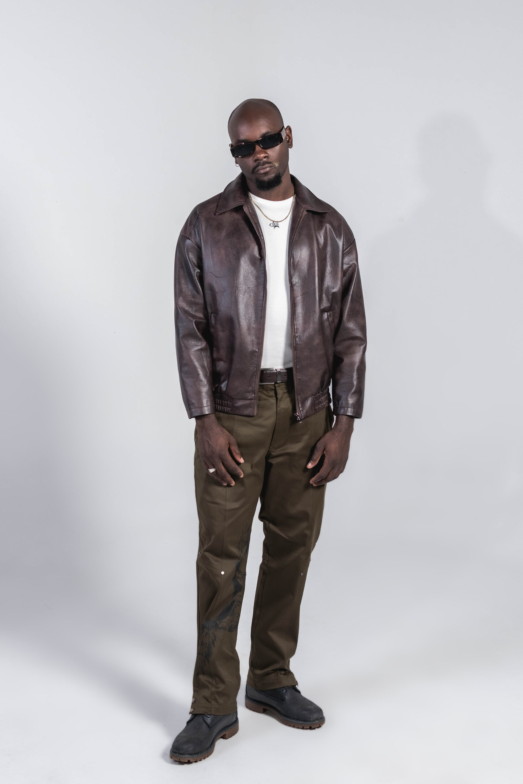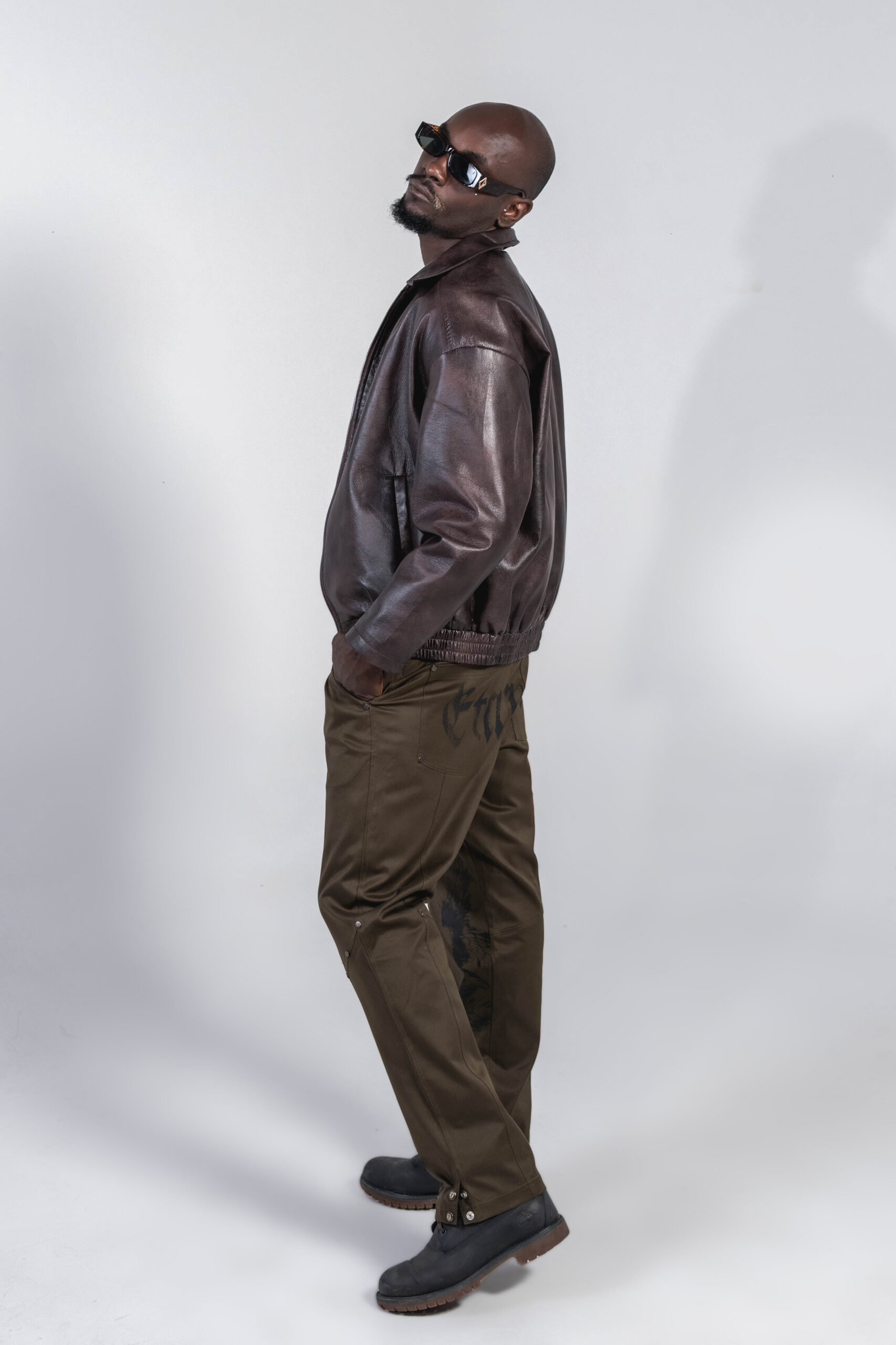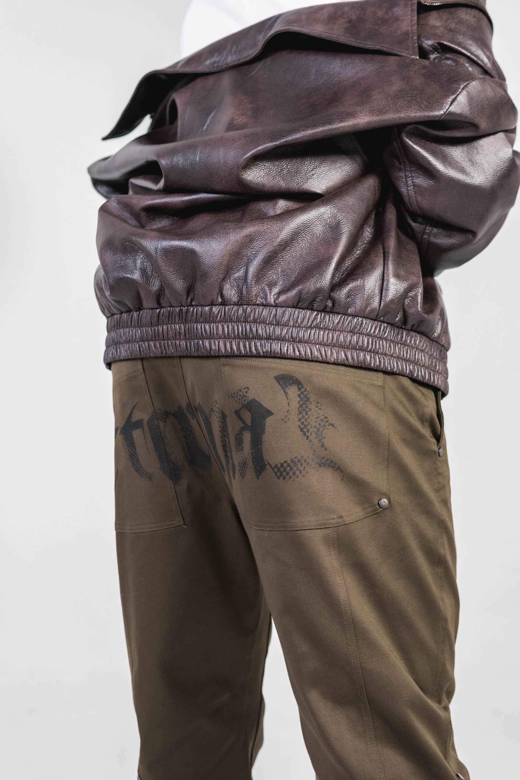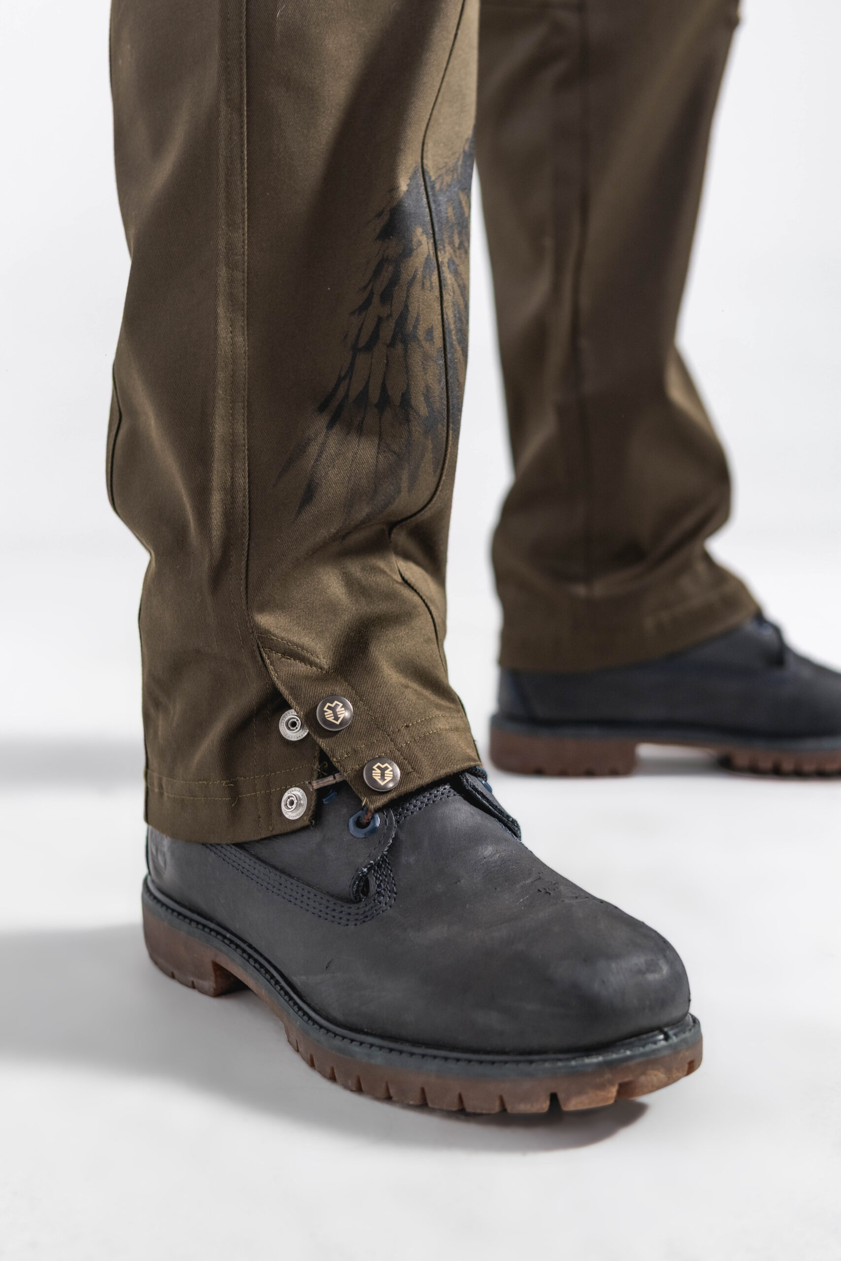 Eternal olive pants Pantalón verde olivo en mezcla de algodón y spandex con estampación en serigrafía, abertura lateral en la bota y broches personalizados, ofreciendo comodidad, movilidad y un acabado detallado.