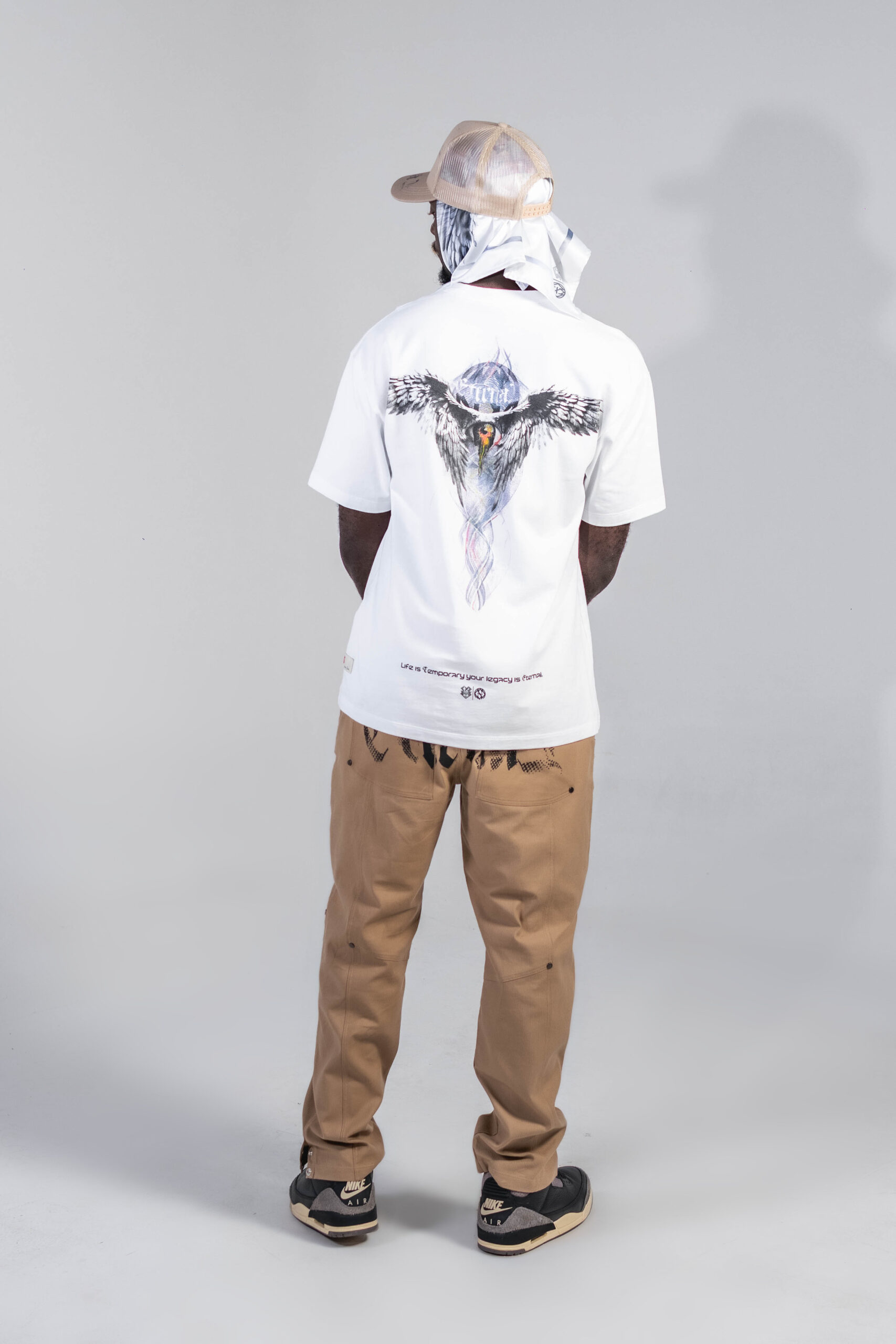 Camiseta blanca en algodón peruano 100% de 260 g, con cuello en rib y estampación en serigrafía de alta definición al frente y en la espalda. En el posterior incorpora un gráfico de alas en tonos fríos con acabado ilustrado. Corte amplio y construcción resistente.